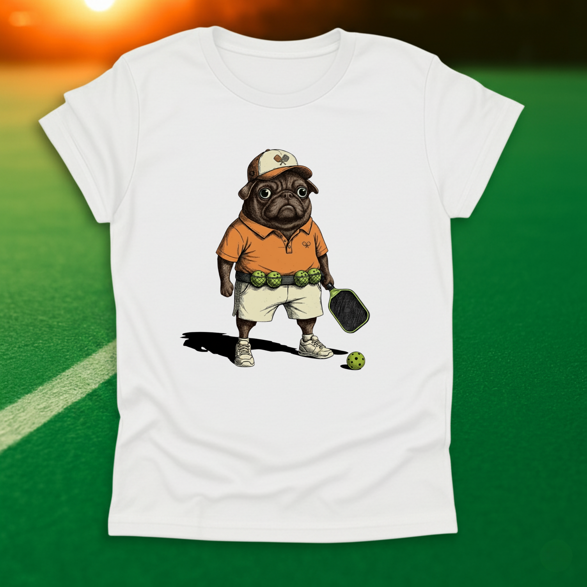 This design brings together two undeniable favorites: pugs and pickleball. Featuring a determined pug decked out in full pickleball gear—complete with paddle, visor, and a belt of pickleballs—it’s equal parts hilarious and adorable. Perfect for players who love the game as much as they love their four-legged friends, this design is guaranteed to turn heads both on and off the court.